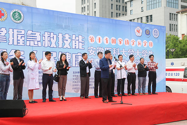 5月11日,在第十个5·12“全国防灾减灾日”前一天,在安徽省医学会、省红十字会、校医学人文研究中心的指导下,校团委、一附院联合省急救中心对我校100名大学生志愿者开展了急救技能培训活动。校党委书记李俊,省红十字会党组书记、常务副会长张青,校党委副书记刘群英,校一附院院长梁朝朝,省医学会秘书长王学东等出席启动仪式并为志愿者授帽,刘群英、梁朝朝、王学东分别讲话。