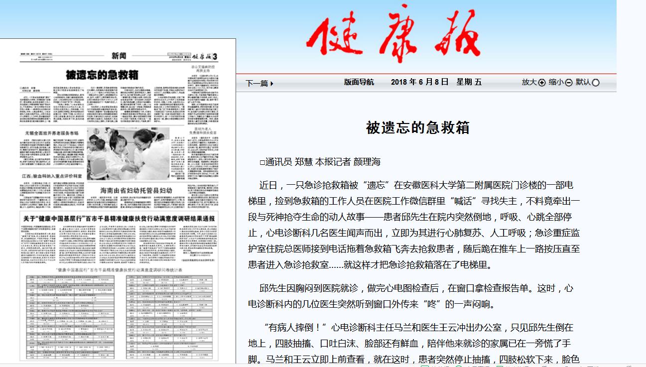 看着患者病情稳定下来,付春生才想起来急救箱没有带回科室,连忙一路返回寻找,最终在医院服务受理中心找到了急救箱。付春生说:“一直在对患者进行胸外按压,不能停,顾不上急救箱,谁帮我把急救箱拉进电梯间的我都不知道,可能出电梯时他们也忘记了。当时真是太紧张了,完全是跟死神赛跑。”