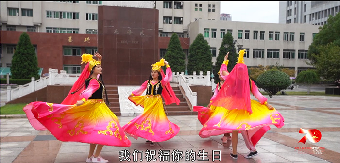 拍摄中,来自我校教学、科研、医疗、管理、后勤一线的教职工和一千余名学生参与本次活动。他们以饱满的热情和嘹亮的歌声,为祖国的繁荣昌盛送去最诚挚的问候与祝福。