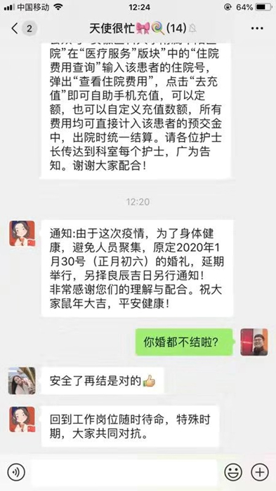 “回到工作岗位随时待命,特殊时期,大家共同对抗。”正月初一上午,在与爱人和父母商议后,我校附属阜阳医院95后护士刘晓雷将取消婚礼的通知告诉了自己的亲朋好友,并在微信群里留下了这样一句话。