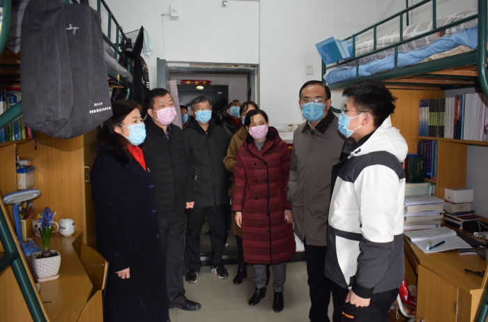 1月31日上午,校长曹云霞及副校长余永强、肖圣龙一行,到学生宿舍看望慰问假期在校的研究生和留学生,为他们送上新春的祝福,同时就新型冠状病毒感染肺炎疫情防控工作进行检查指导。