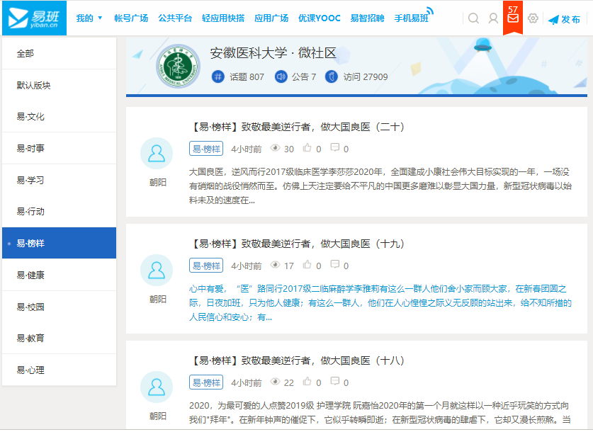今年春节,一场新型冠状病毒感染的肺炎疫情防控战牵动着所有人的心,疫情当前,安医人凝心聚力,众志成城。医护员工更是日夜奋战,只为尽快结束这场战“疫”。人人都想贡献自己的一份力量,我校学子也不例外。近期,我校易班发展中心在易班网以“致敬最美逆行者,做大国良医”为题号召同学们用文字的力量向榜样致敬,向公众传递信心,凝聚战胜疫情的勇气和决心。征文活动开展短短几天,得到近千名学子的积极响应。