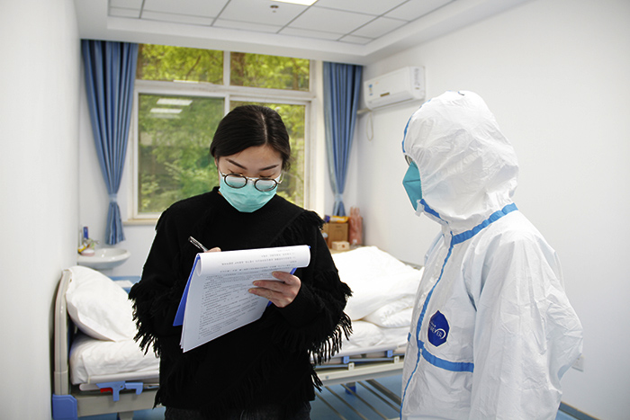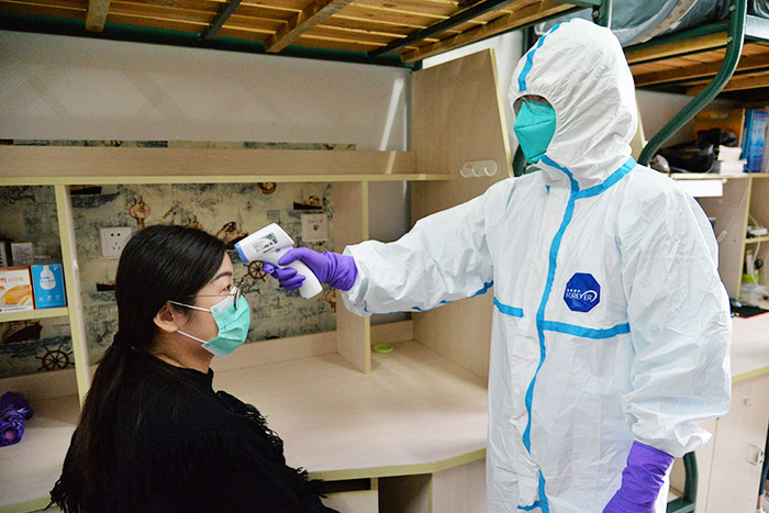 本次预演练包括疫情接收和报告、校医院防疫人员上门诊疗、学校防疫人员陪同患者前往发热门诊检查及返校解除隔离等3大环节5场景内容。现场模拟了在校本部学生宿舍某号楼某寝室一同学自测体温达37.8℃(超过37.3℃)后,该同学第一时间拨打辅导员电话报告个人情况,辅导员及时报告学院、学校医院和宿管中心负责人,学院、学校医院负责人上报至疫情防控办,防控办报告至应急指挥部,学校立即启动应急响应,防疫各职能部门协调联动开展工作的情况。演练中,应急医疗组负责人对整体流程、各环节要点工作以及发热学生在发热门诊就诊后可能出现的四种情况及应对措施作了说明。