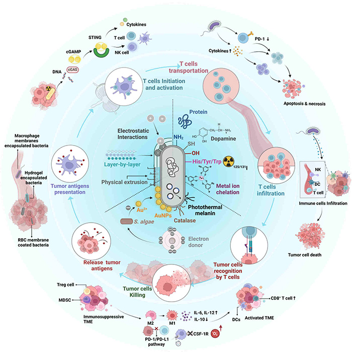 近年来,细菌因其免疫激活特性、易于工程化和肿瘤定植能力在肿瘤免疫治疗中引起了广泛的关注。为了进一步提高细菌治疗的安全性、有效性和临床转化潜力,通过对细菌表面进行修饰或工程化,提高细菌体内安全性、赋予细菌额外的功能已成为当前的研究热点。