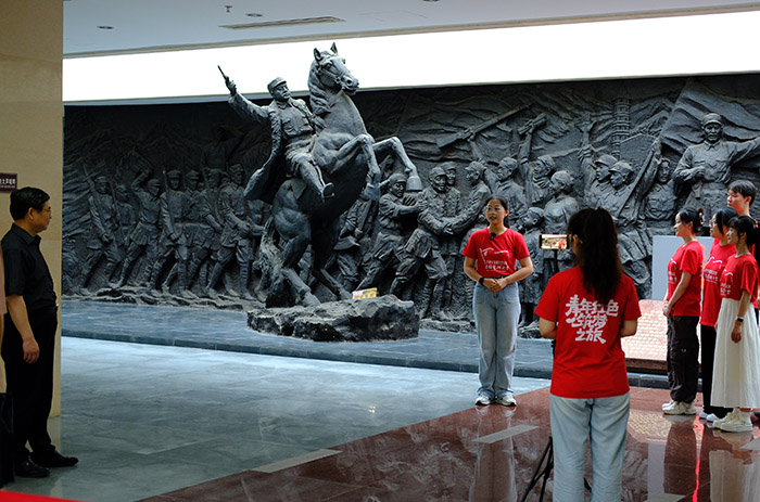 在岩寺新四军军部旧址纪念馆,谢瑞瑾与实践团队员们共同瞻仰了新四军纪念雕塑,依次参观了序厅、岩寺集结、誓师东进、军民情深、抗日烽火、铁军传承六个展区。展厅内一件件珍贵的历史文物、一幅幅记录峥嵘岁月的图片、一个个可歌可泣的革命英雄故事,以不同的形式再现当年新四军将士在岩寺的光辉历程,展现了新四军军部机关设在岩寺金家大院以及新四军在此集中进行组编、军政训练等基本情况。