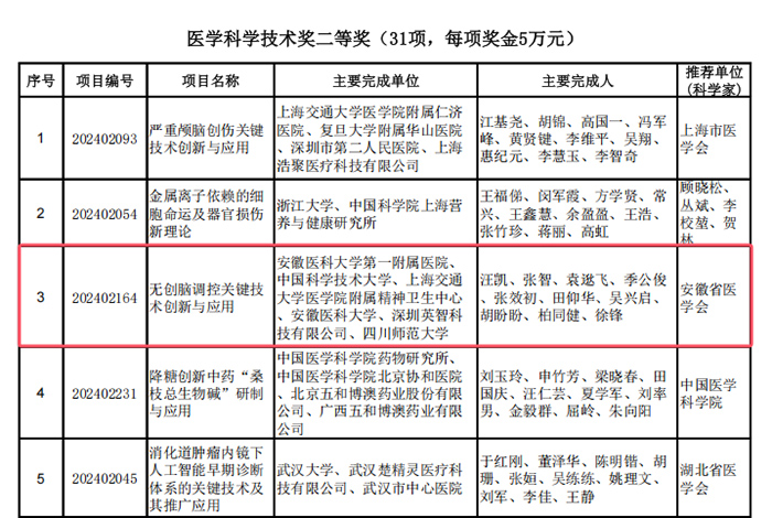 1月6日,中华医学会公布2024年中华医学科技奖获奖项目,我校汪凯、张智教授团队申报的成果“无创脑调控关键技术创新与应用”获评中华医学科技奖医学科学技术奖二等奖,展示了我校在无创脑调控关键技术领域的突出贡献。