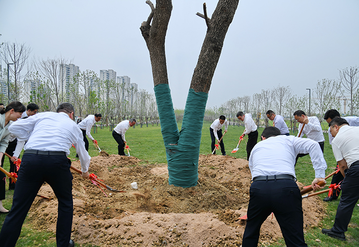 挥锹填土、引水浇灌、覆土固定……在新医科中心图书馆西侧的草坪上,校领导班子共同种下了承载着对学校未来美好期许、寓意“传承百年安医精神”的香樟,王琦、翁建平一同为树木挂牌。